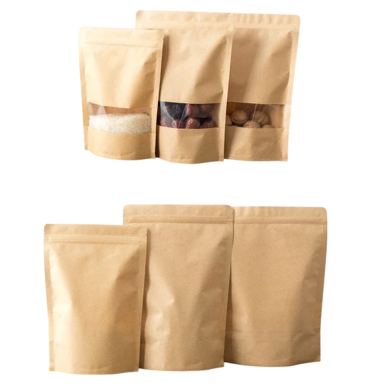 Kraft bags have a natural beige appearance complemented by a transparent window, which makes the contents easily visible. The stand-up design with a reinforced bottom ensures stability when storing or displaying products on sales counters. This type of packaging is an eco-friendly alternative to plastic bags and is suitable for repeated use. It combines practicality, quality and aesthetics in one.