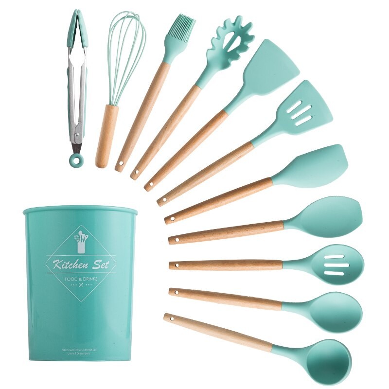 Contents of the package: 1x stand, 3x spoon, 2x turner, 2x ladle, 1x basting brush, 1x whisk, 1x tongs, 1x spatula