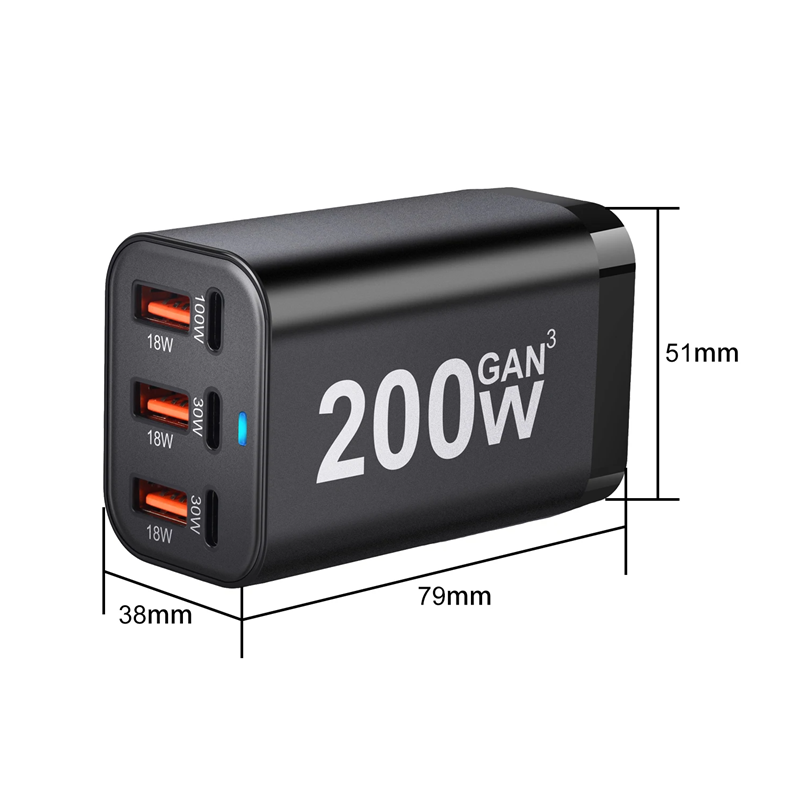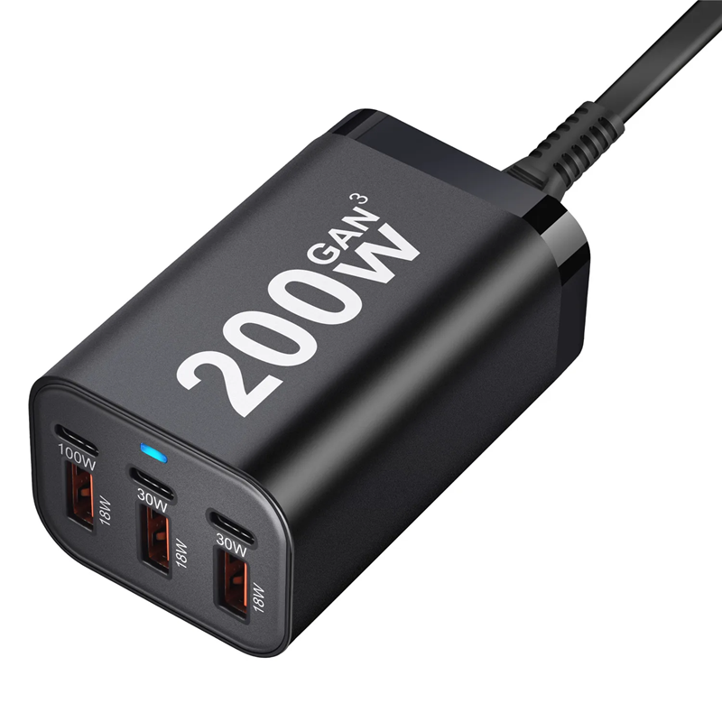 Powerful 200W adapter with 6 ports allows charging multiple devices at once. Supports 110–240 V, power indicator, USB C and USB A outputs. Full description