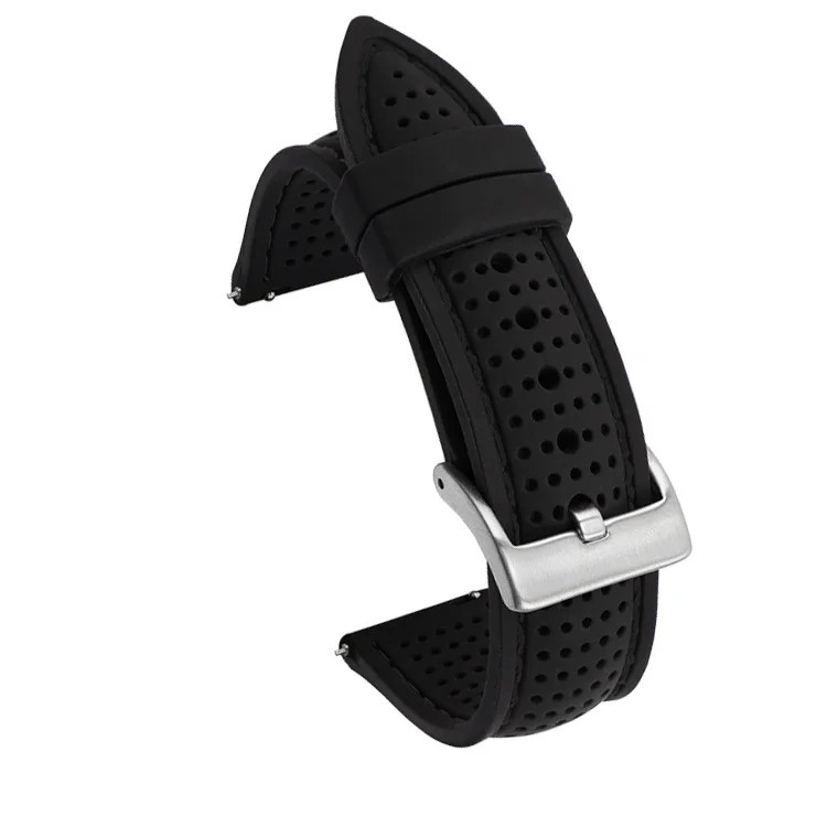 This silicone rubber strap with a width of 24 mm is designed to meet the demands of users looking for a sturdy, durable, and comfortable sports strap for everyday use. The soft silicone provides high flexibility, a pleasant contact with the skin, and long durability. The material is waterproof, breathable, and sweat-resistant, making it an ideal choice for an active lifestyle, sports training, hiking, and casual wear. The perforation ensures good ventilation and stable comfort even during prolonged wear.