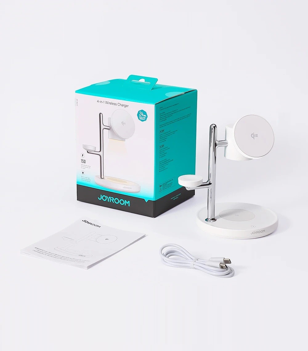 - Package contents: 1× 4-in-1 wireless charger, 1× USB-C power cable, 1× user manual