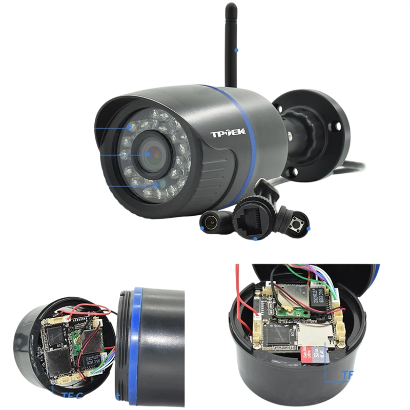 Night mode is ensured by 24 LED lights with a range of approximately 15–20 metres, enabling monitoring even in low light conditions. Recordings can be stored on a TF card up to 64 GB (not included) or utilise third-party NVR storage support.