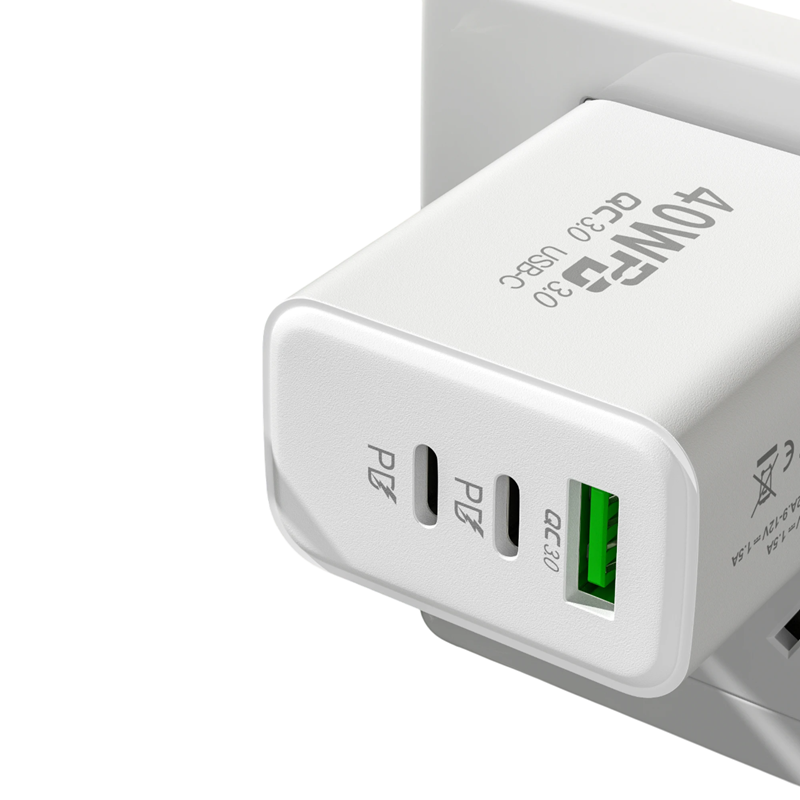 Compact 40W adapter with 2x USB C and 1x USB A port. Supports PD and QC 3.0, ideal for travel and office use, EU plug. Full description