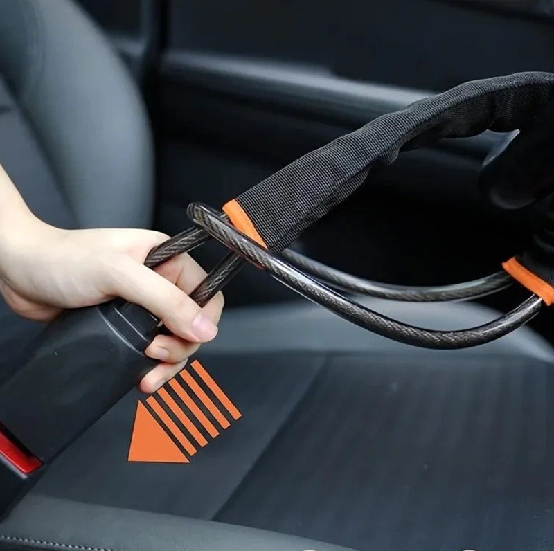 The steering lock is a practical security feature designed for the mechanical protection of a vehicle. The stainless steel construction provides strength and durability for everyday use. With a length of 43 cm, it is suitable for most standard steering wheels and allows for stable attachment. The seatbelt locking system restricts the steering wheel's rotation and significantly reduces the possibility of unauthorised manipulation of the vehicle. Additionally, the visible design acts as a preventive measure and may deter attempts at theft.