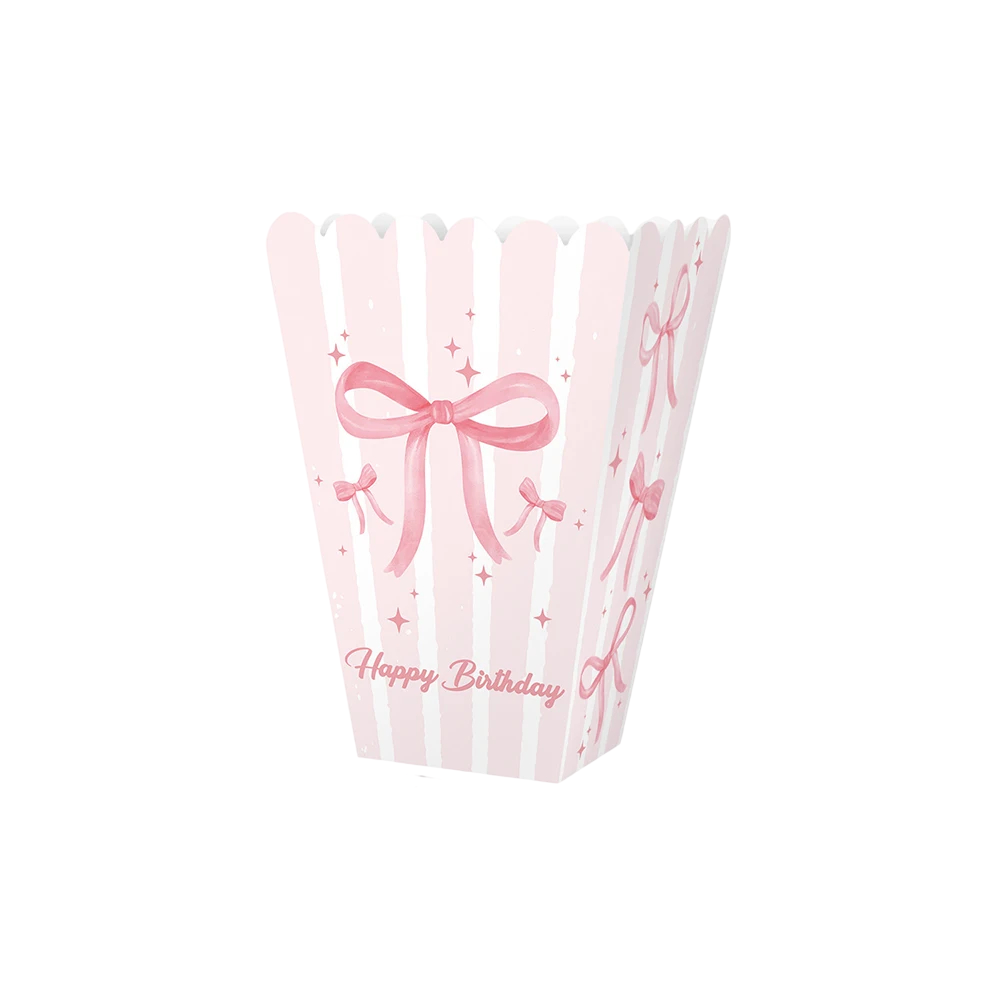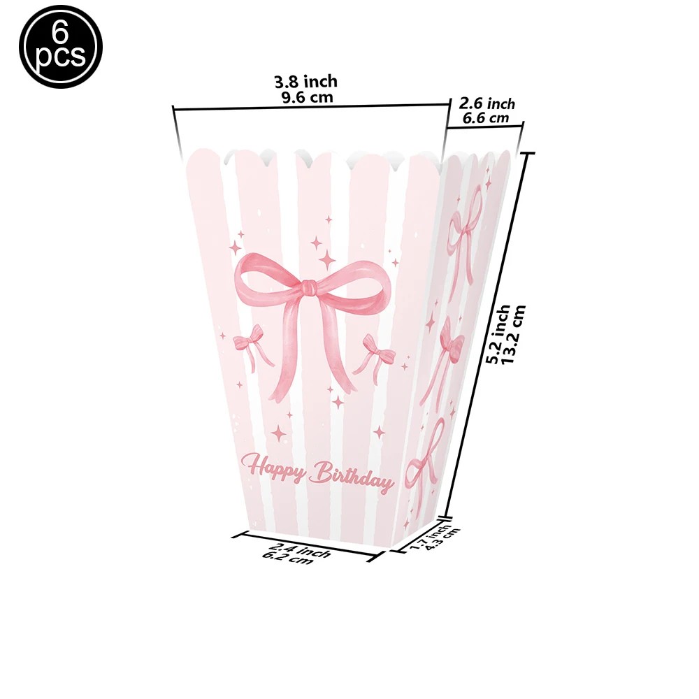6 pcs Paper Popcorn Boxes 9.6 × 13.2 × 6.2 cm Pink Stripes Bow Happy Birthday Party Candy Bar Boxes