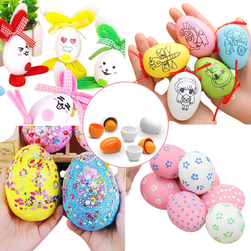 6× wooden egg (3 non-dismantleable, 3 dismantleable into parts), 1× wooden box