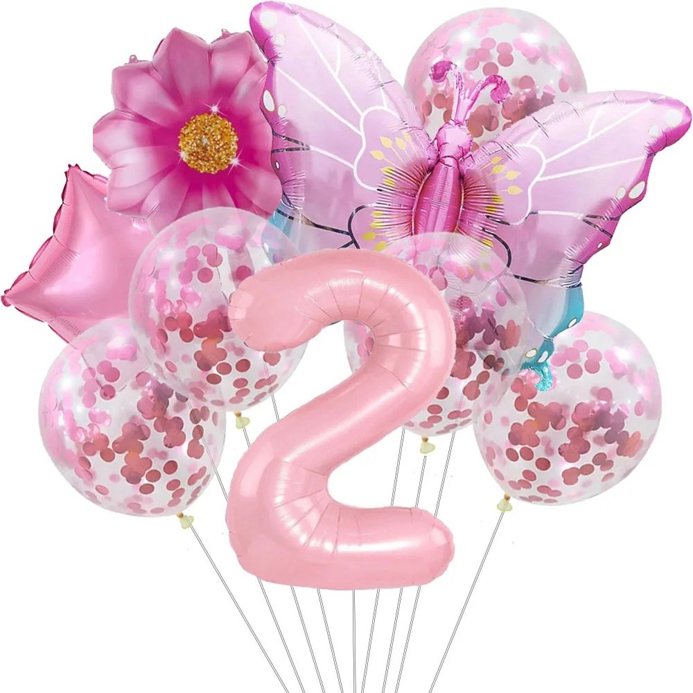 9 pcs Birthday Balloons Number 2 Butterfly Flower Confetti Latex and Foil Balloons Party Decorations for Second Birthday Children's Celebration
