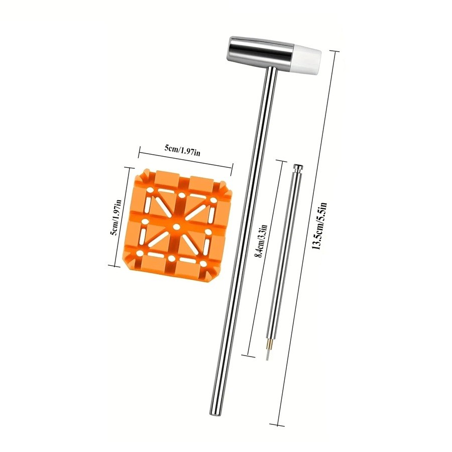 This 9-piece watch tool set is designed for easy and safe replacement and adjustment of watch straps. With the combination of strap remover, metal hammer, sturdy block and a set of interchangeable attachments, you can easily adjust the length of a metal bracelet or replace an old strap with a new one. This set is suitable for both professional watchmakers and home use. Durable materials ensure long life and reliable performance during everyday use. Due to its compact dimensions (5x5 cm block, 13.5 cm hammer, 8.4 cm remover), the tools are easy to store and transport.