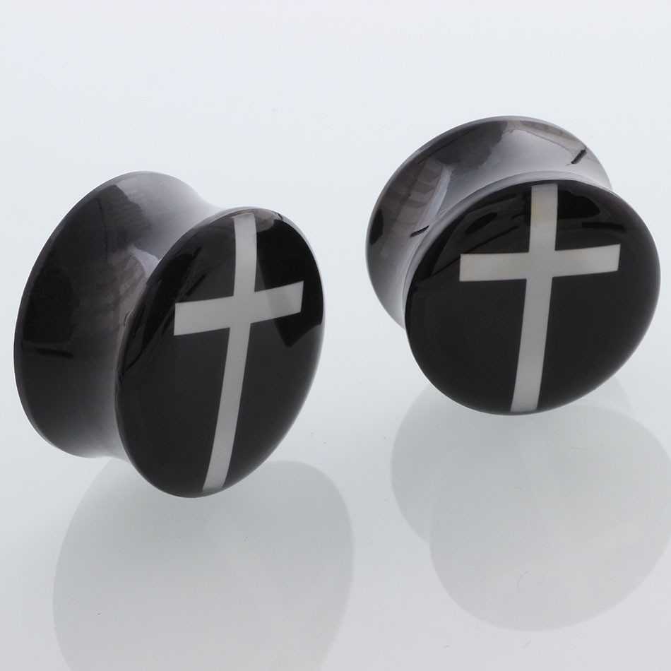 Elegant, black, and high-quality acrylic plug with a white cross.