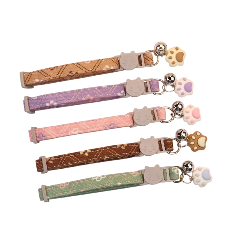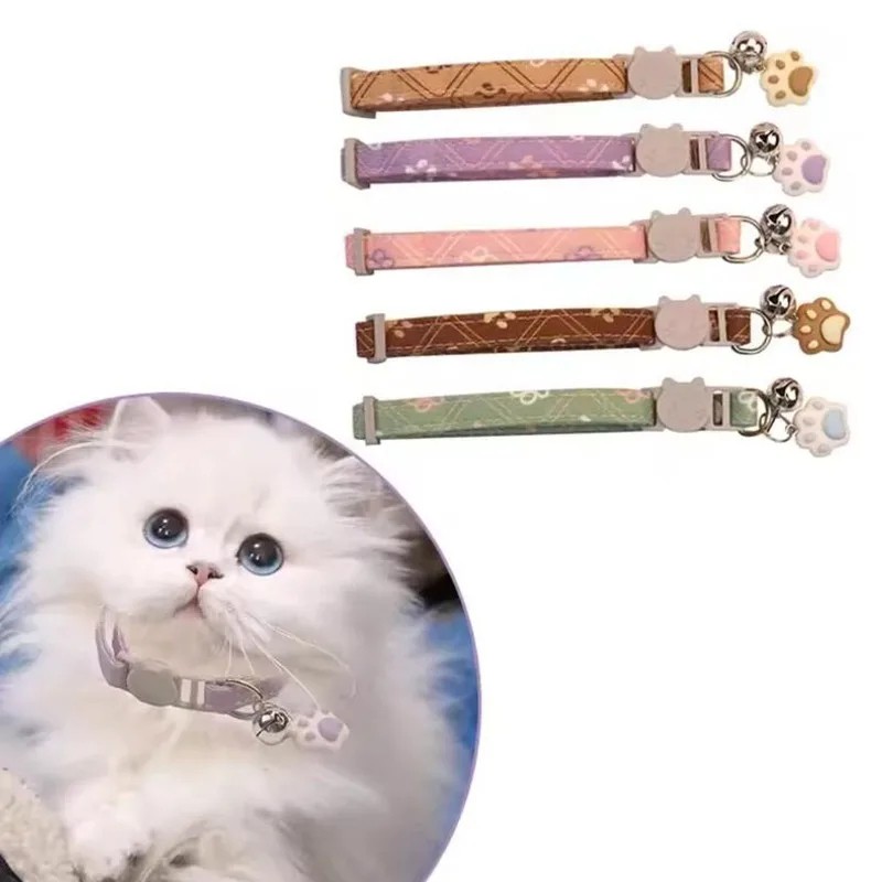 Adjustable Cat Collar 34 cm with Paw Print Design Safety Buckle Bell Pendant Soft and Comfortable Strap