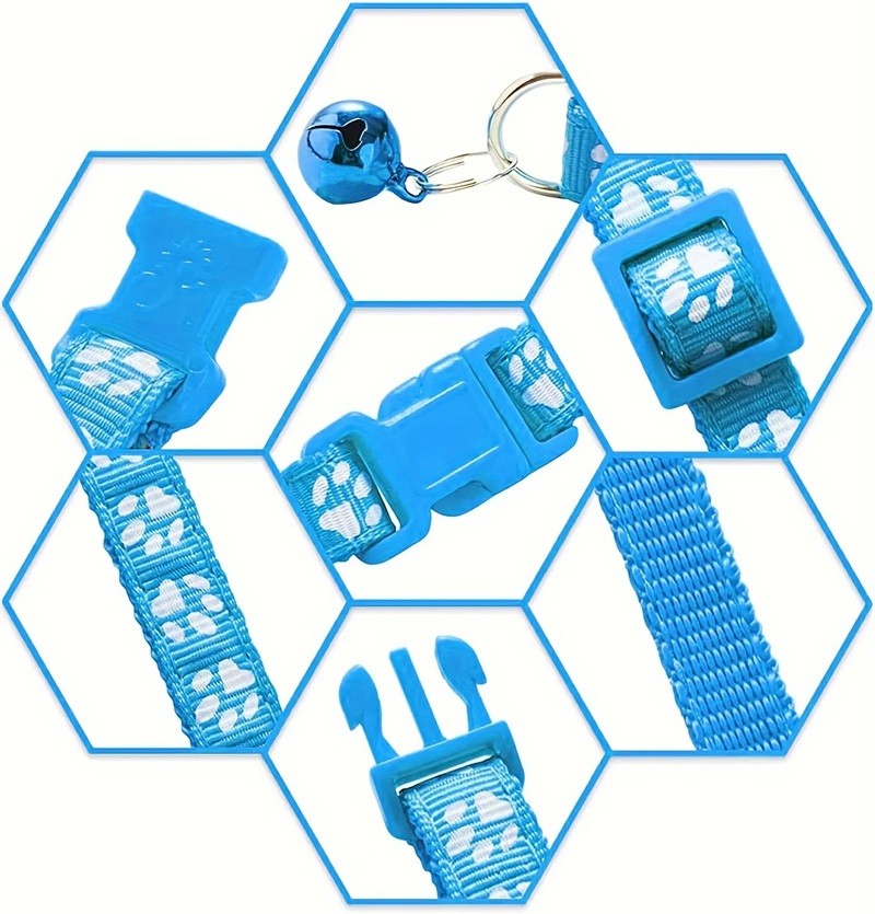 A safe and adjustable collar for cats featuring a paw print design and a bell. Durable material, suitable for everyday wear. Full description