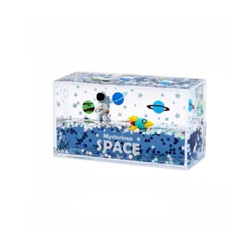 The astronaut floats in liquid. Dimensions: 9.5 x 2.9 x 5.2 cm. With stars. Full description