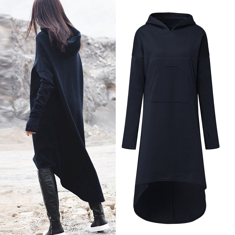 Stylish autumn hoodie dress with long sleeves and a hood.