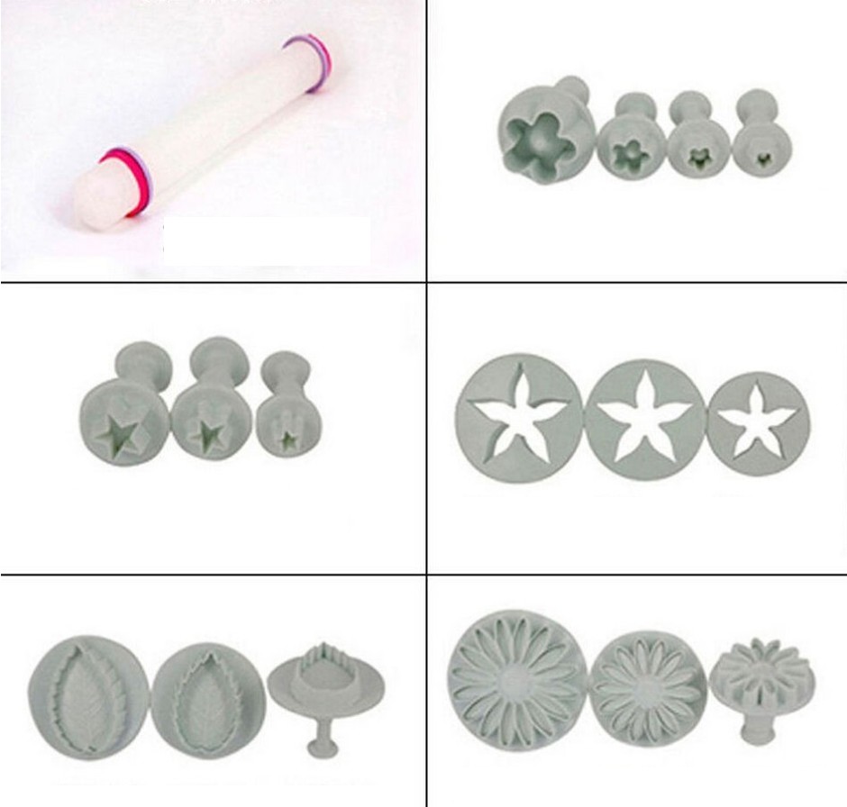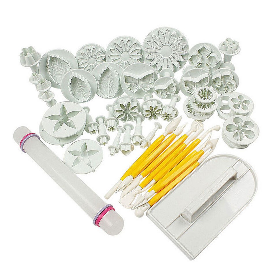 Includes a rolling pin, modelling cubes, cookie cutters in various floral patterns, and a cake smoother.