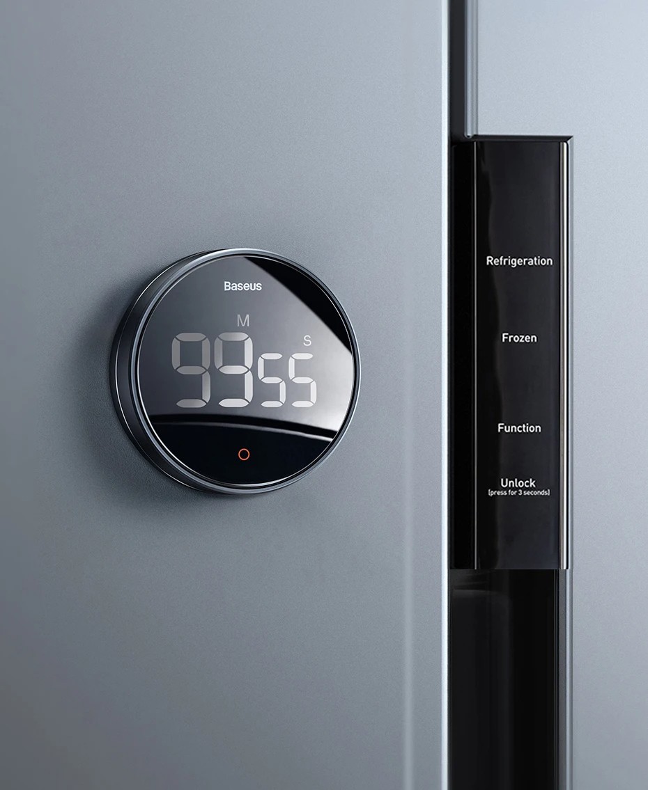 The modern and elegant Baseus digital timer in black is the perfect assistant for the kitchen, during workouts, studying, or work. It features rotary control for quick setting of minutes and seconds, a large LED display, clear visibility, and three selectable volume modes – silent, low, and high.