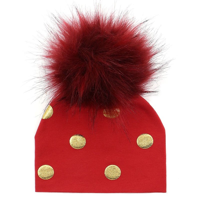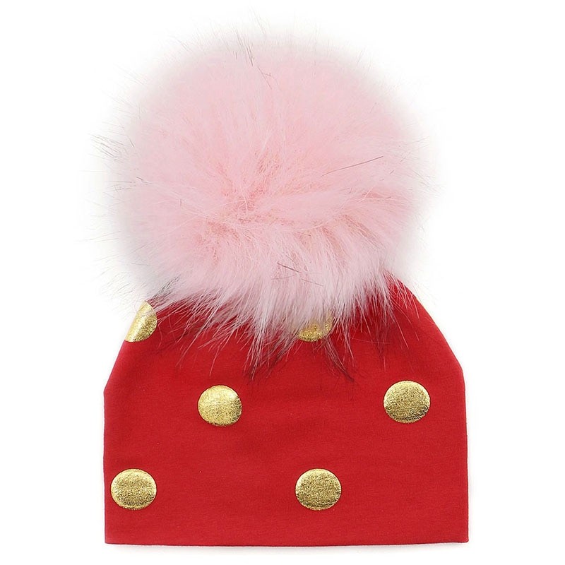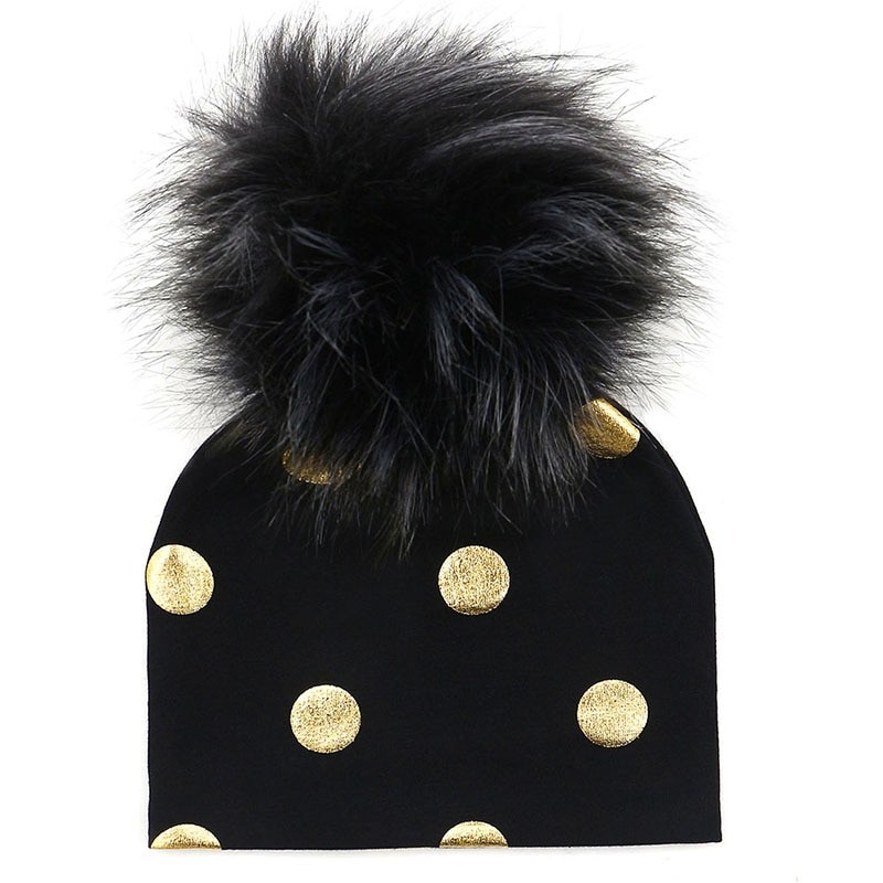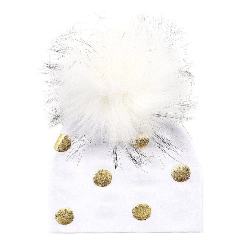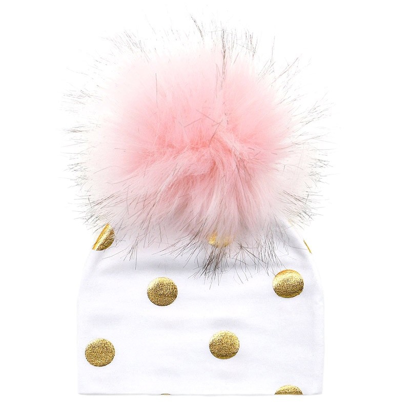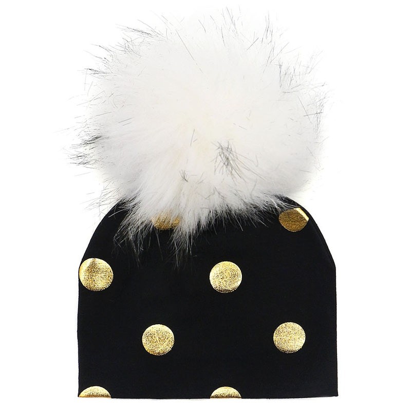 Cotton children's hat with gold polka dots.