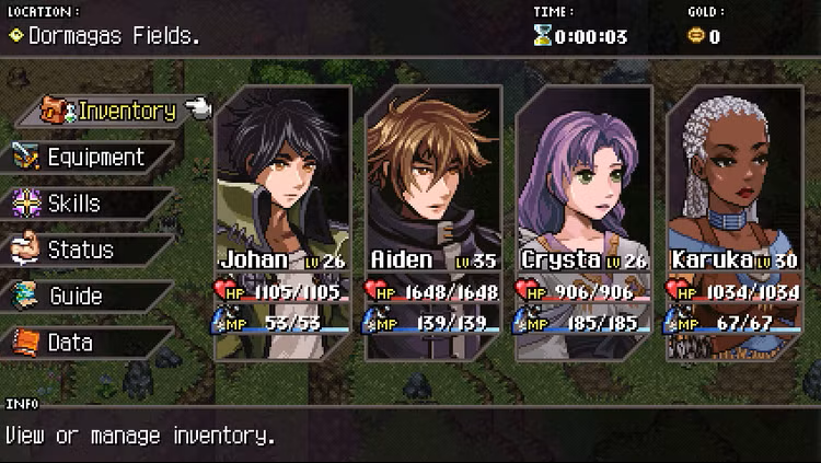 Choose from classic or story mode(s) and satisfy your experience. Meet and recruit a total of six playable characters, each with unique stats and skills. Acquire new equipment and level up to become more powerful.