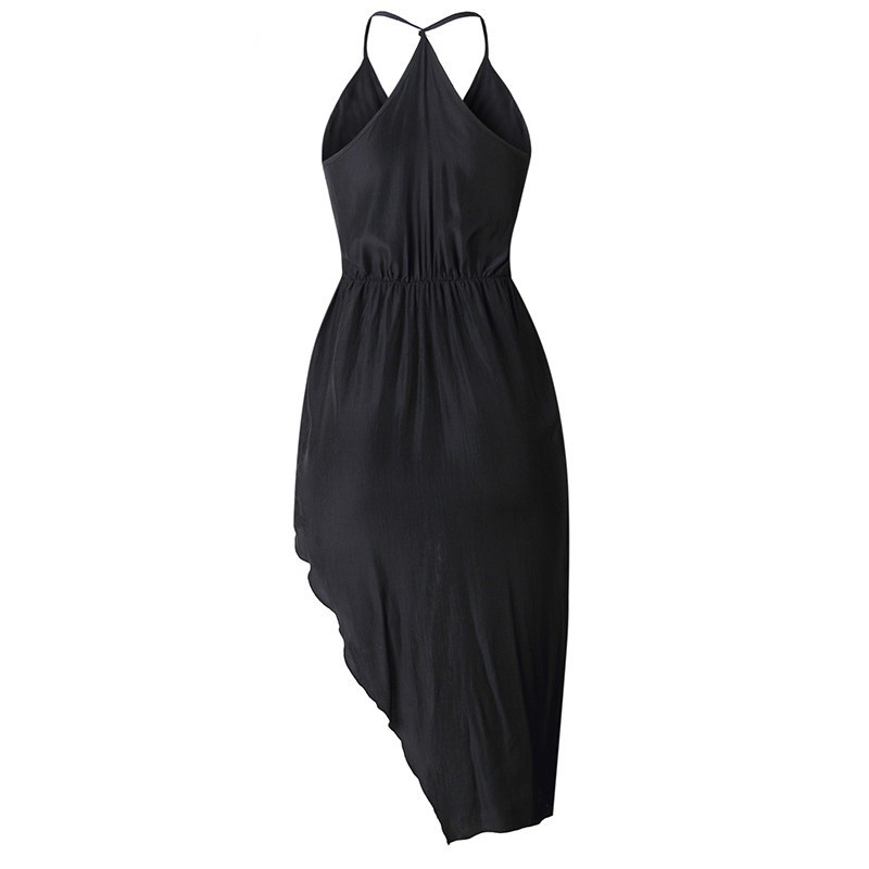 Luxurious black dress below the knee with an asymmetric skirt adorned with lace.