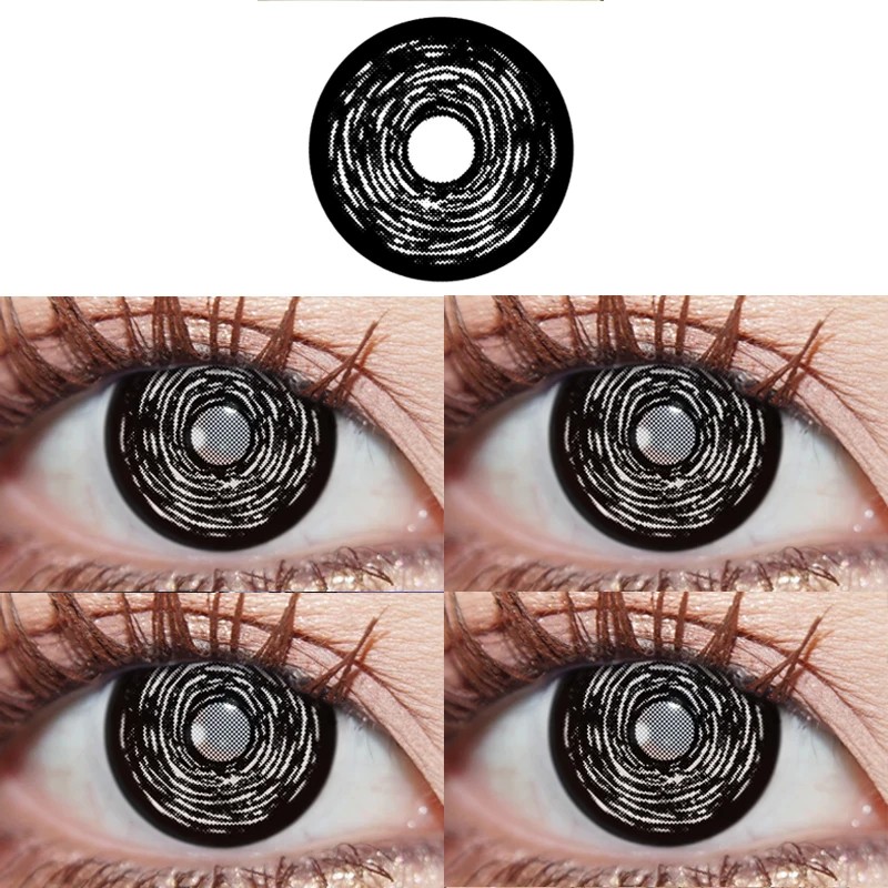 Coloured contact lenses are designed for a striking eye styling with a hypnotic effect. The black base almost completely covers the iris, creating a strong contrast. On this base is a prominent white spiral that creates an impression of movement and optical illusion. This design is intense and eye-catching, typical for anime and fantasy style. The lenses are ideal for cosplay, themed events, and creative makeup.