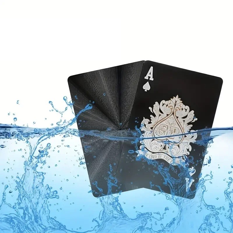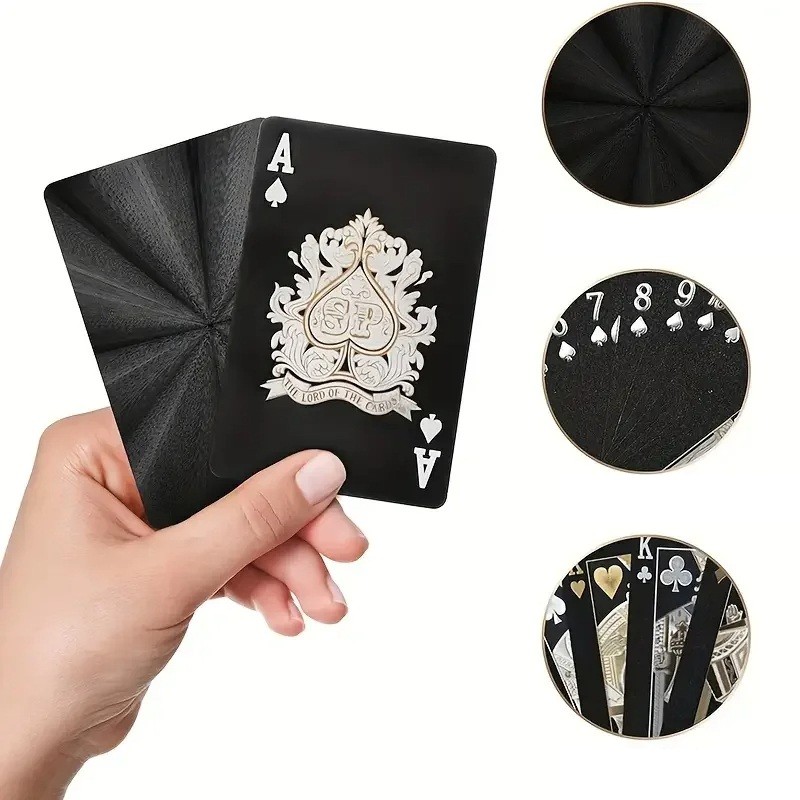 This set of black plastic playing cards is designed for those seeking exceptional style, an elegant appearance, and high durability. The surface of each card is finished in a matte black colour with metallic glossy decor and detailed relief, which looks extraordinarily luxurious. The set includes 55 cards measuring 57 x 87 mm, suitable for poker, rummy, canasta, and other card games.