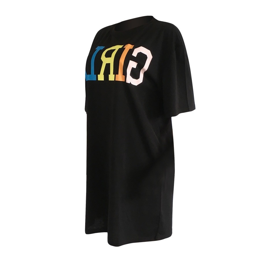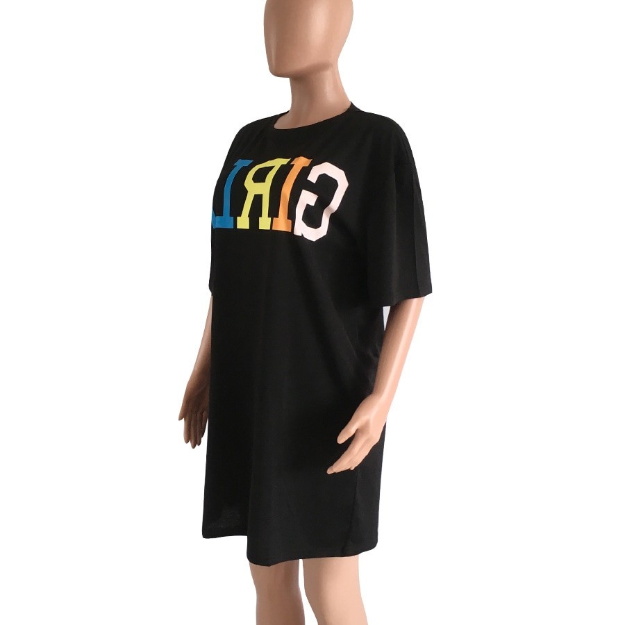 Loose-fitting women's t-shirt dress with a stylish print.