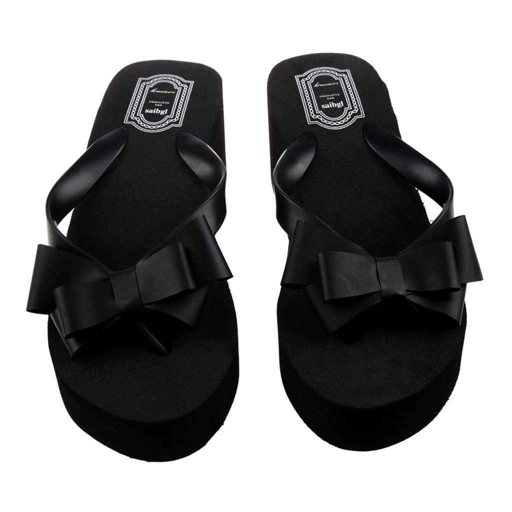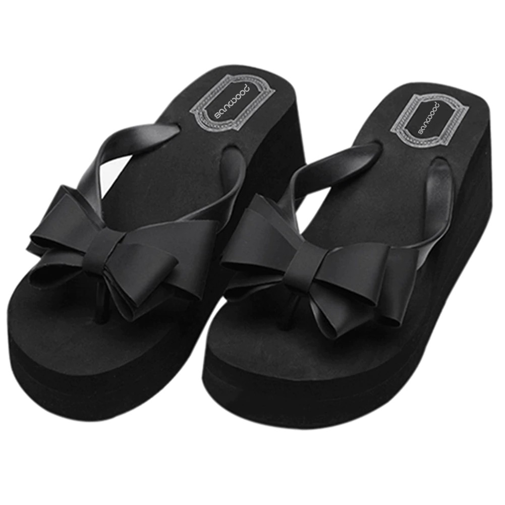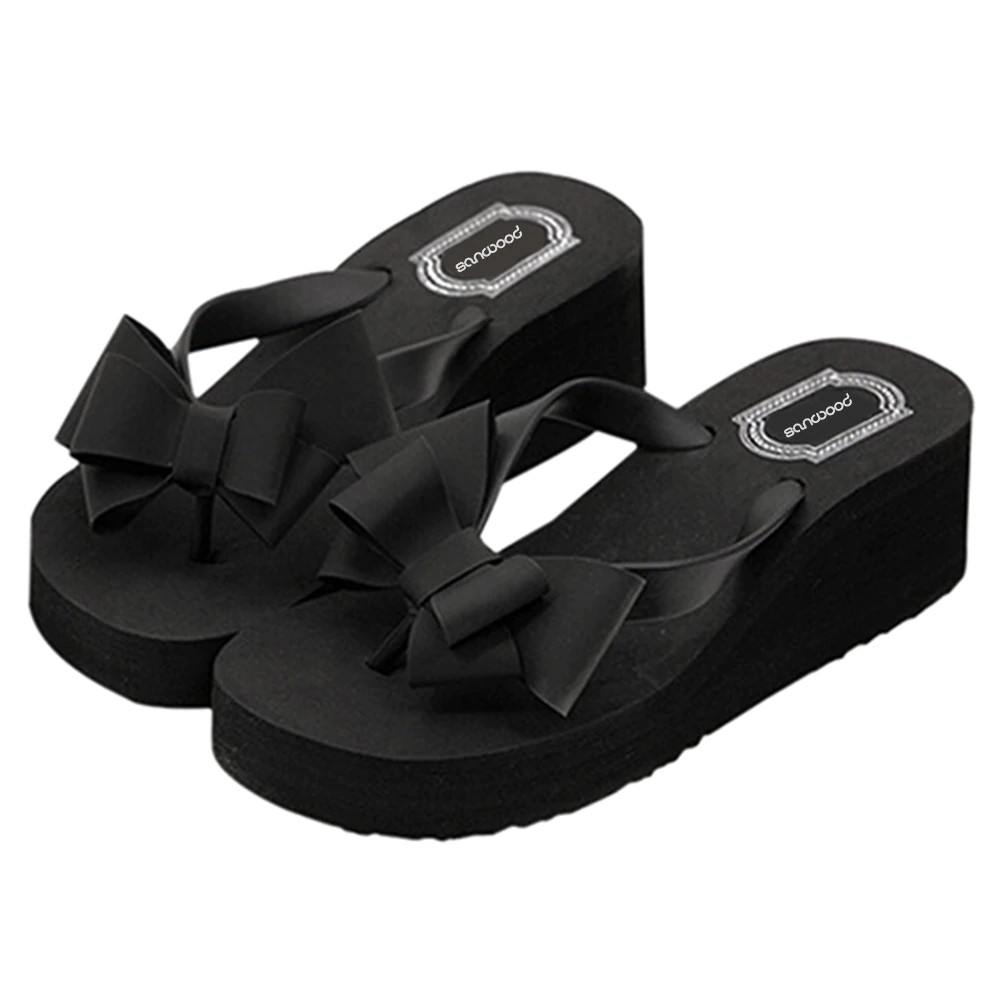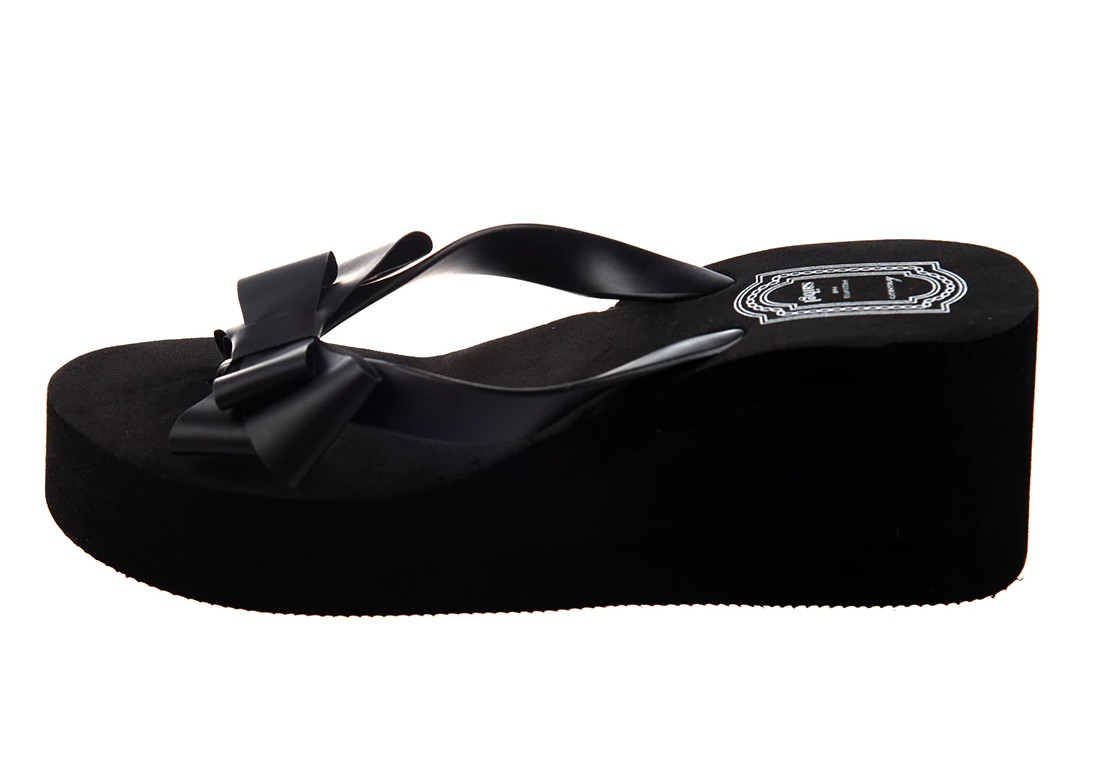 You will love these platform flip flops adorned with a bow. The flip flops are in black.