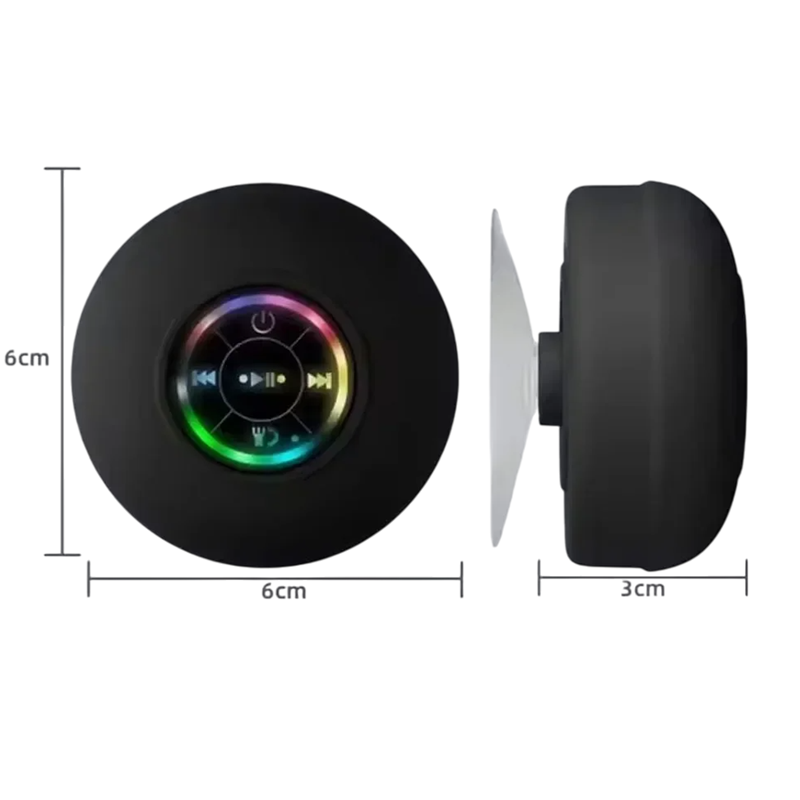 Waterproof wireless speaker with LED light and suction cup, ideal for the bathroom. Bluetooth 5.0, hands-free microphone and portable design. Full description