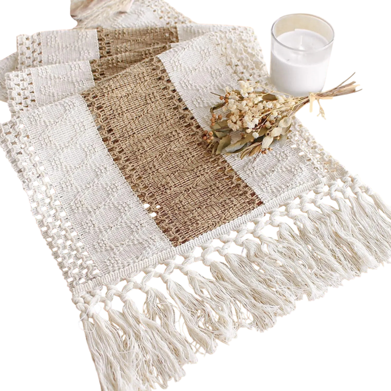 Boho Table Runner 30x140 cm Linen Rustic Style with Macramé Fringes Burlap and Cotton Farmhouse Summer Decoration Wedding Celebration
