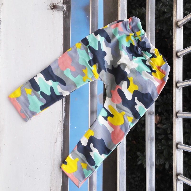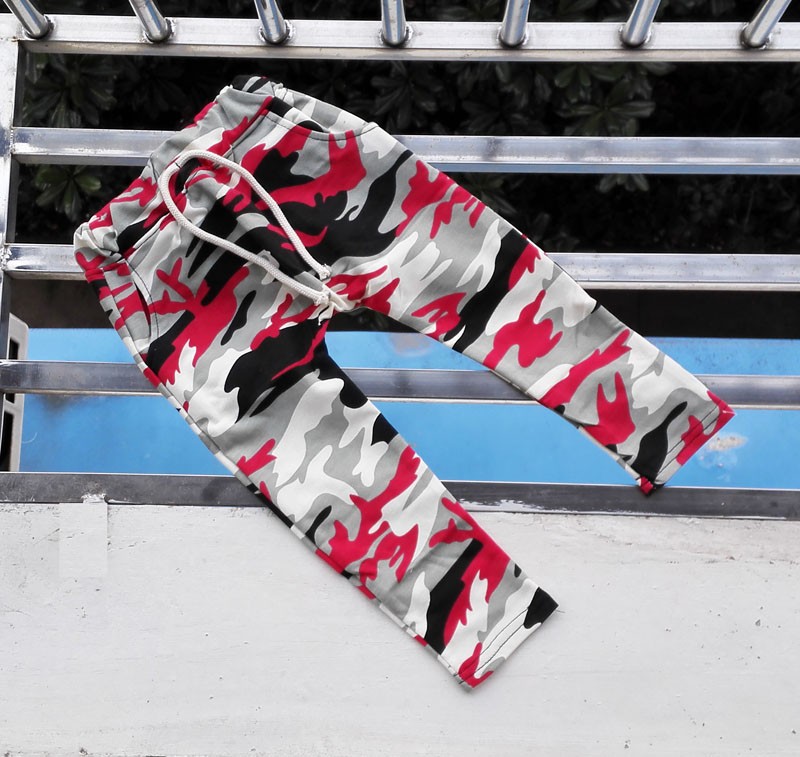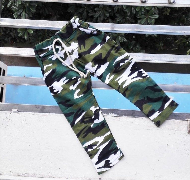 Beautiful boys' tracksuit bottoms with a camouflage pattern, also known as military style.