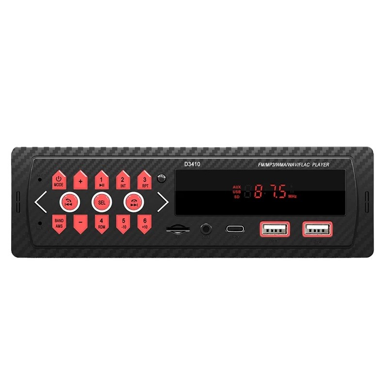 The BQCC D3410 car radio combines modern features with a simple design suitable for universal use. It supports FM radio, MP3, WMA, WAV, and FLAC files and allows connection via Bluetooth, USB, AUX, and TF card. With dual USB ports, you can simultaneously play music and charge mobile devices. You will also appreciate the 7 colour backlighting that enhances the appearance of your interior. The built-in power protection safeguards your devices and ensures safe operation.