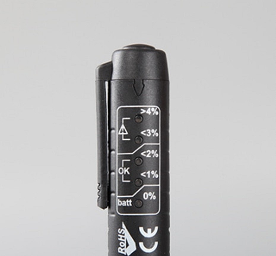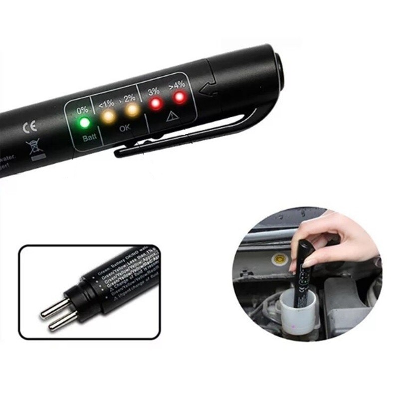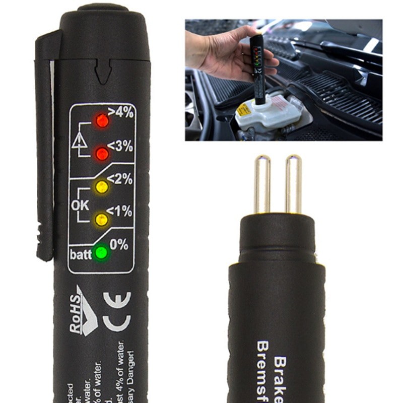 For simple quality control of brake fluid. 5 LED indicators showing the percentage of water in the brake fluid. If the water content in the fluid exceeds 3.5%, the fluid must be replaced.