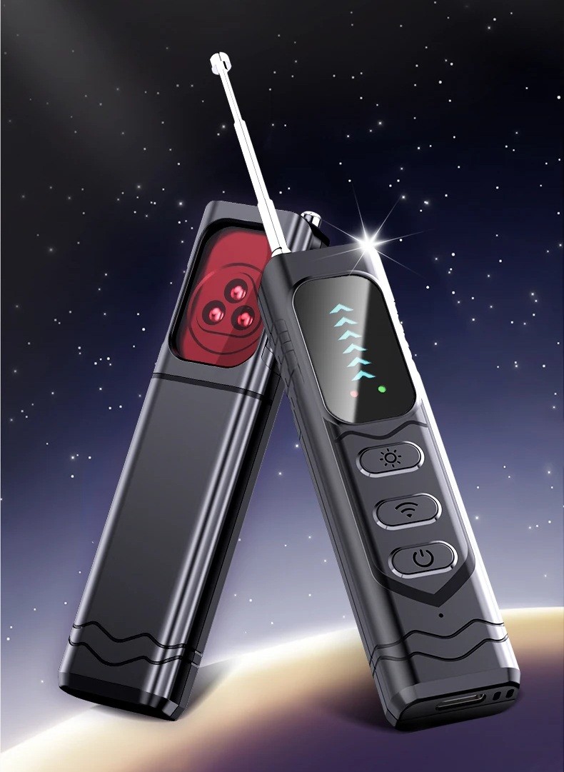 Compact security detector for searching hidden cameras, bugs, and tracking devices in rooms, cars, and hotels. Full description