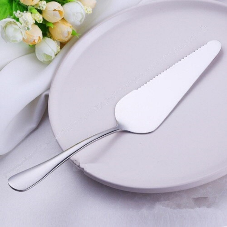 The spatula features serrated edges on one side for easier portion cutting.