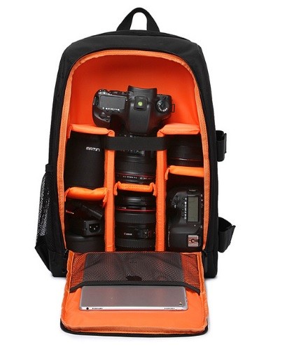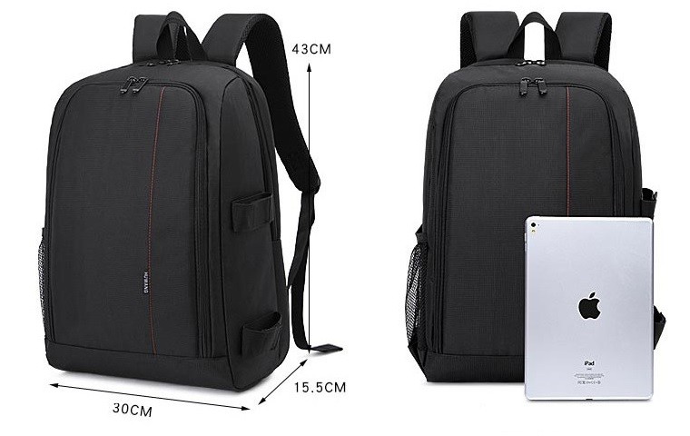 - Holds a DSLR camera with a lens and 3-4 additional lenses and accessories
