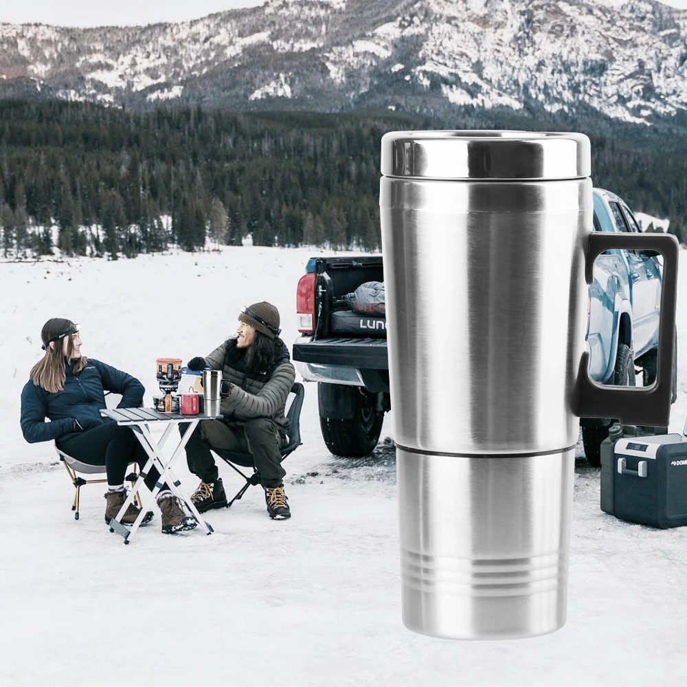 Using it is very simple. Fill the mug with liquid (do not exceed the maximum capacity), close the lid, and connect the power cable to the cigarette lighter socket. Heating will start after connecting to the power supply. It is recommended not to use the device without liquid and not to open the lid during heating. The lid is not completely airtight; it has a hole for pouring and steam release. Thanks to its compact dimensions, the mug fits into most cup holders in cars. The non-slip base ensures stability during the journey. This travel electric mug is a practical accessory for everyday use in the car, long trips, and camping.