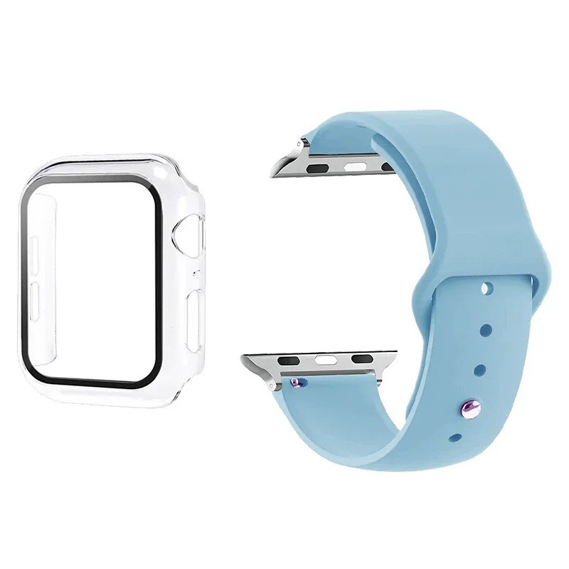 This combination of accessories is suitable for Apple Watch users who want to protect both the display and the construction of the watch while also replacing the strap. The protective glass helps shield the screen from scratches, the case protects the edges of the watch, and the strap allows for comfortable wear on the wrist. Due to compatibility with several generations of Apple Watch, the accessories can be used with multiple models of this size. The sensitivity of the touch controls and the ability to charge the watch remain intact during use.