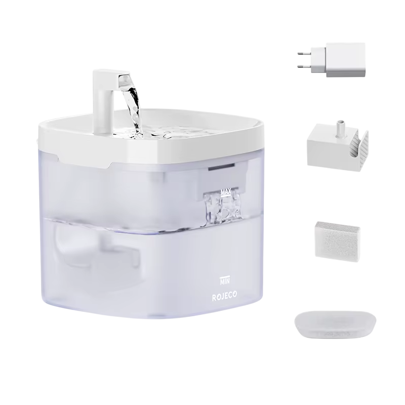 • Package contents: 1× fountain, 1× EU adapter, 1× sponge filter, 1× carbon filter, 1× water pump