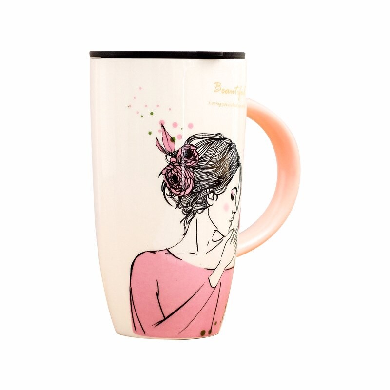 Mug featuring a painting of a girl and a practical lid.