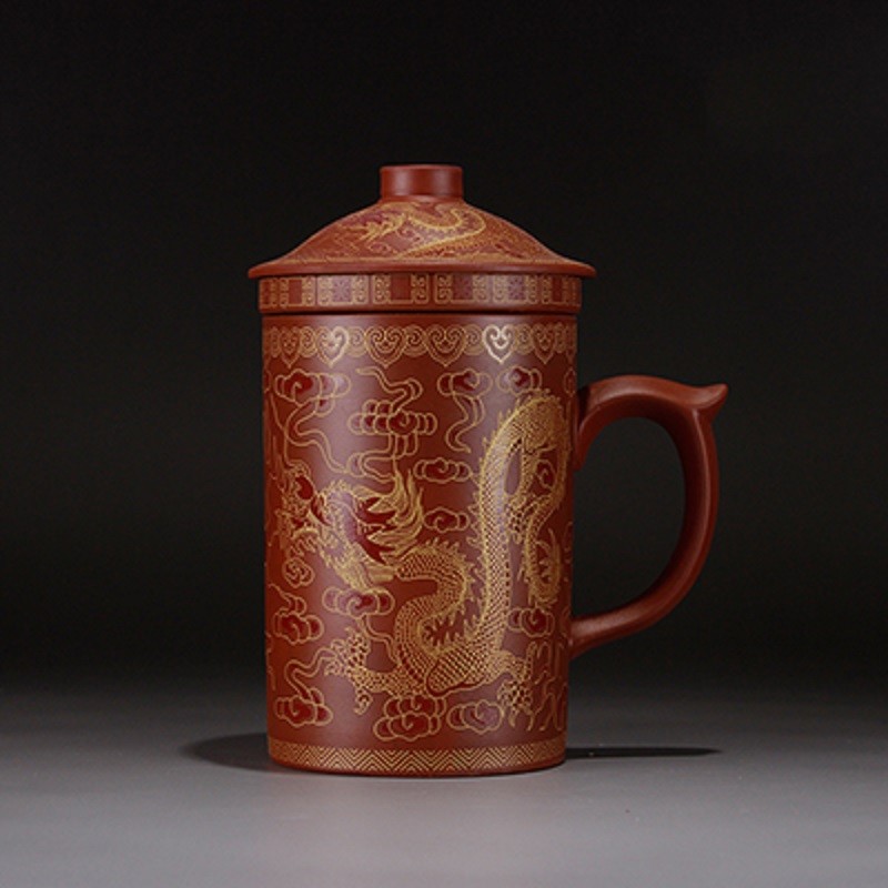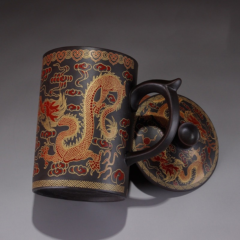 A teapot in traditional Chinese style with painted patterns and a tea filter inside.