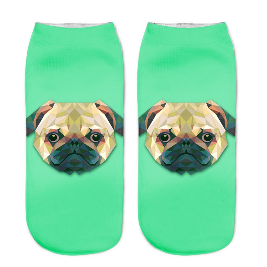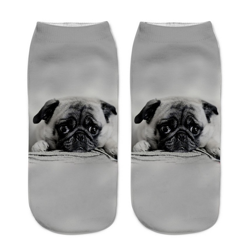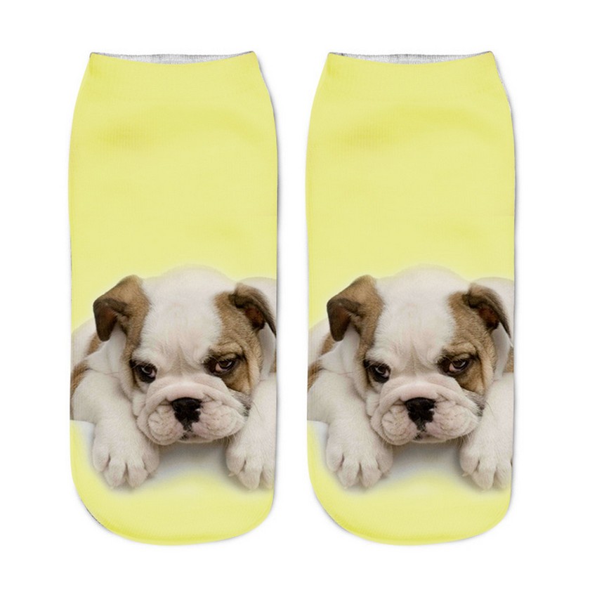 The socks feature a print of various dogs.