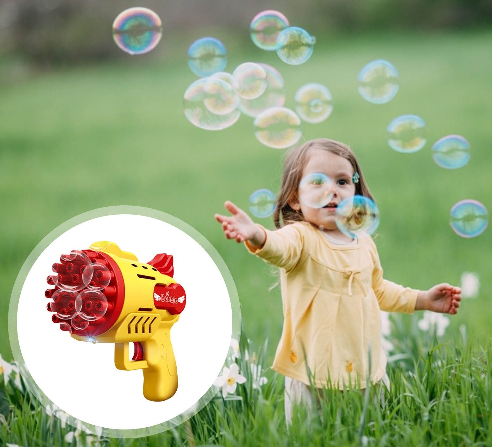 This fun and innovative toy will keep your children entertained for hours. This children's bubble machine is an automatic bubble blower powered by batteries, which will surely delight your little ones. It is equipped with 29 holes that create endless streams of bubbles. Additionally, it features built-in LED lights that make the bubbles glow in the dark! Perfect for parties, picnics, and days in the park. For everyone who loves fun.