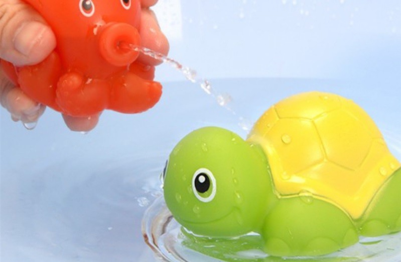 We suck water into the toy by pressing it underwater and spray water by squeezing it after pulling it out of the water.