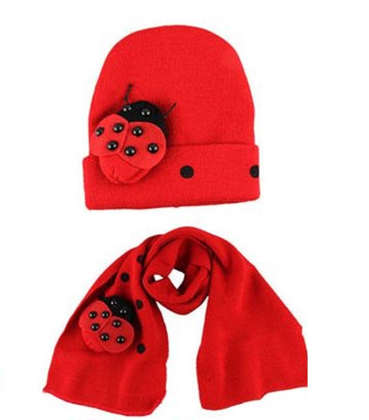 A beautiful set of a hat and scarf featuring a ladybird in the same colour scheme.