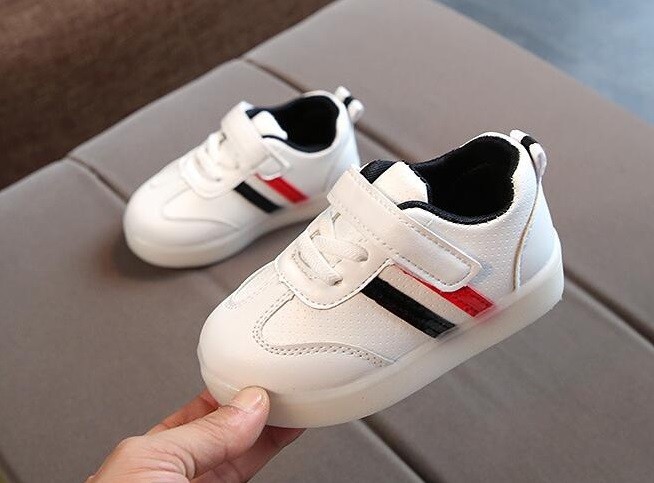 The trainers are soft, have LED lights in the sole, and fasten with Velcro.