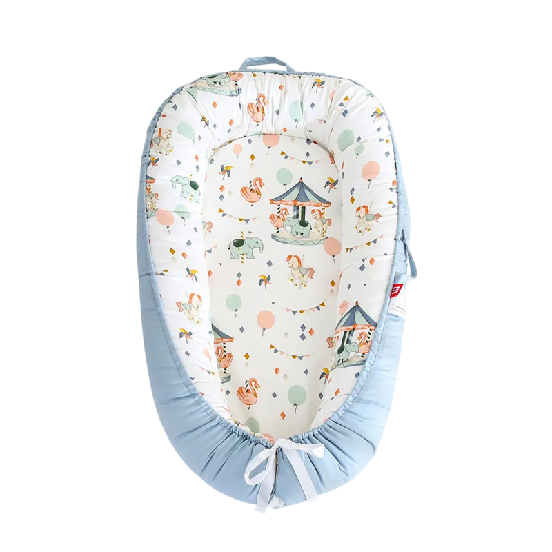 This children's nest is designed for comfortable and safe sleep for newborns, whether at home in the parents' bed or on the go. It is made from high-quality and soft cotton fabric, which is breathable and pleasant to the touch. With dimensions of 88 x 53 x 30 x 68 cm, it offers plenty of space for the baby while protecting against rolling over thanks to the raised edges. The nest is adjustable using a drawstring, allowing the size to be adapted as the baby grows. The cute animal carousel pattern makes the nest not only practical but also an aesthetically appealing addition to the nursery.