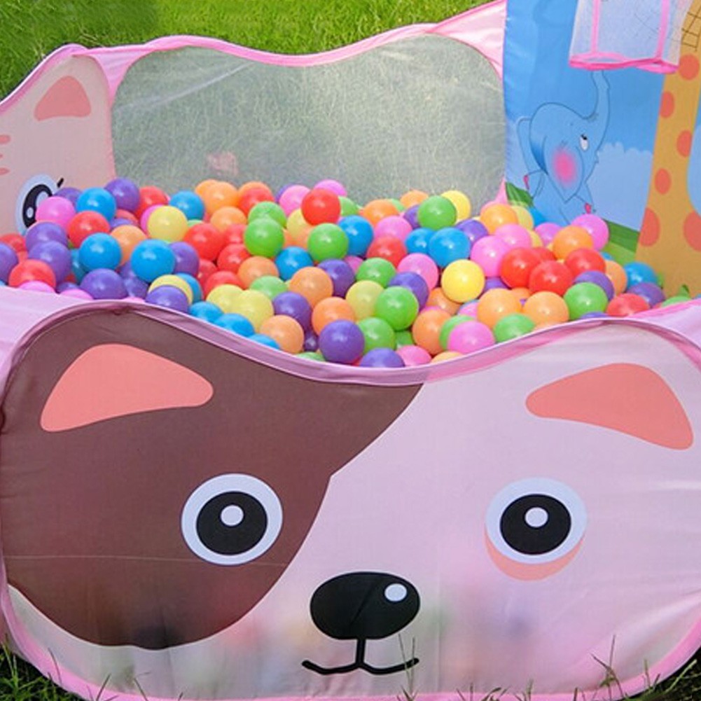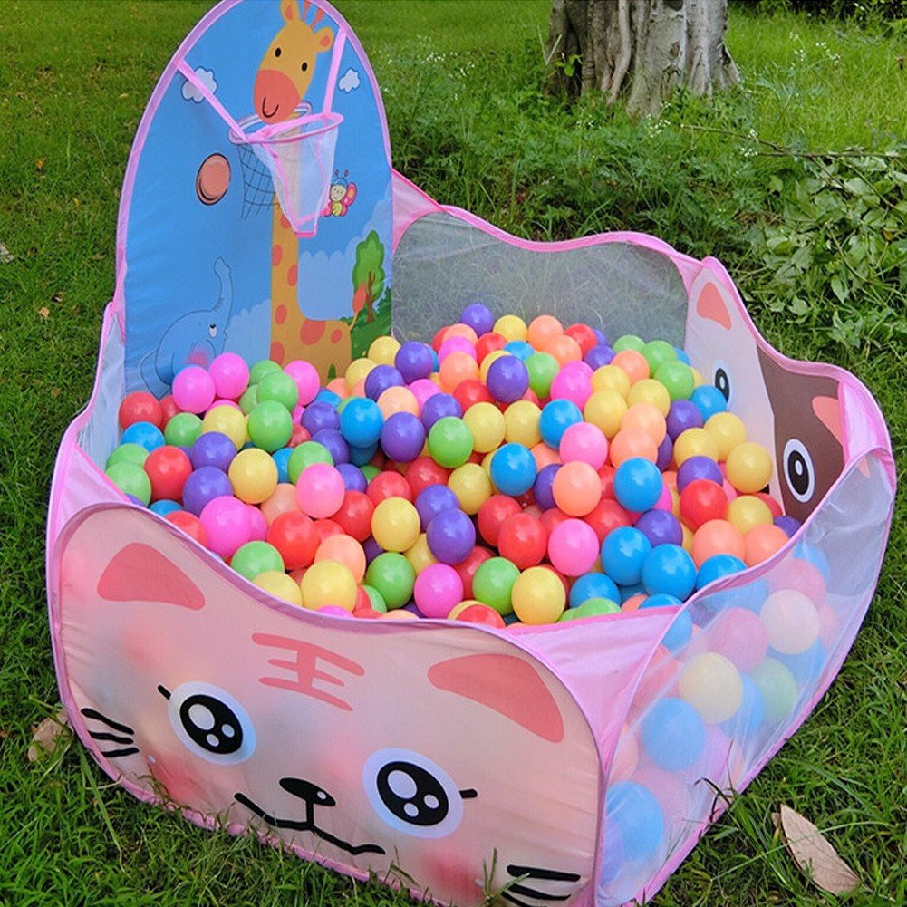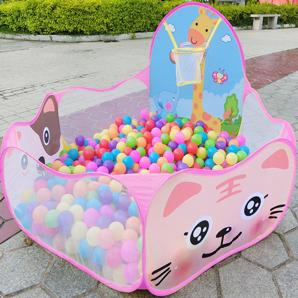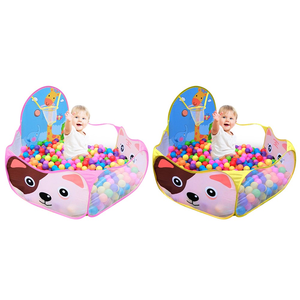 A basketball hoop is attached to the playpen, into which children can throw the balls.