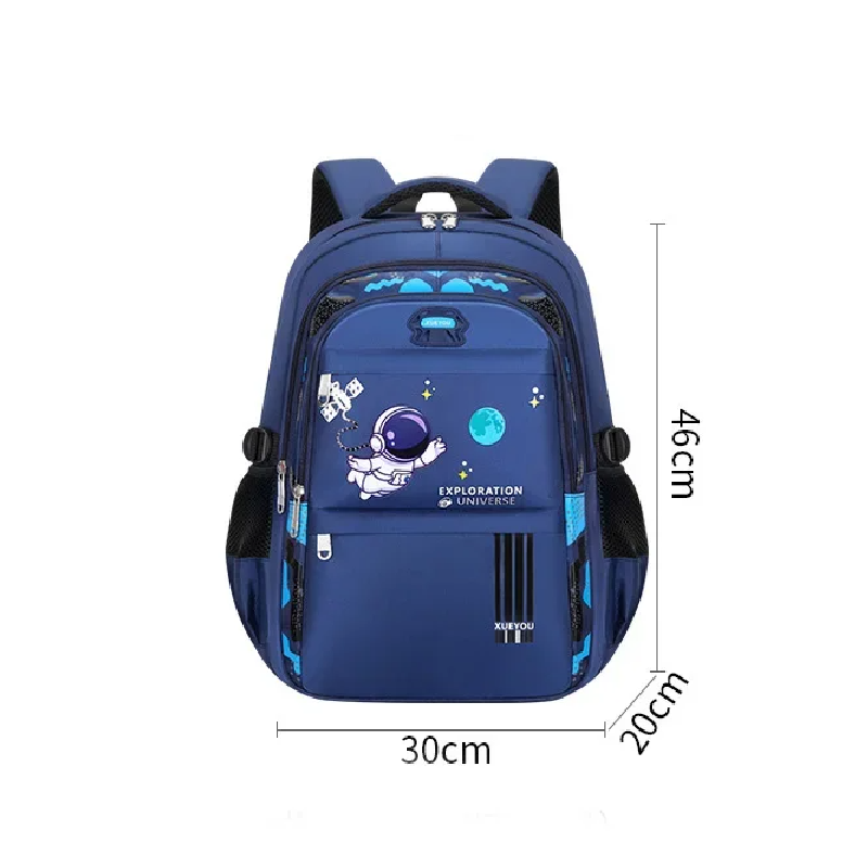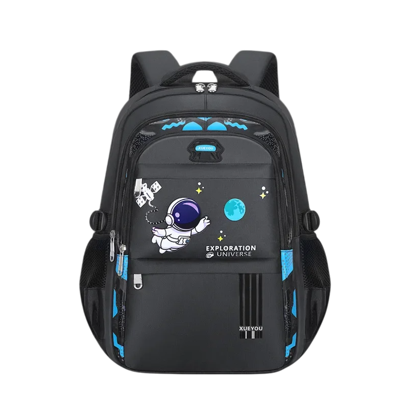 Spacious school backpack with an astronaut design for boys in Year 3 to Year 6. Waterproof, padded, with 7 pockets and space for a bottle. Full description