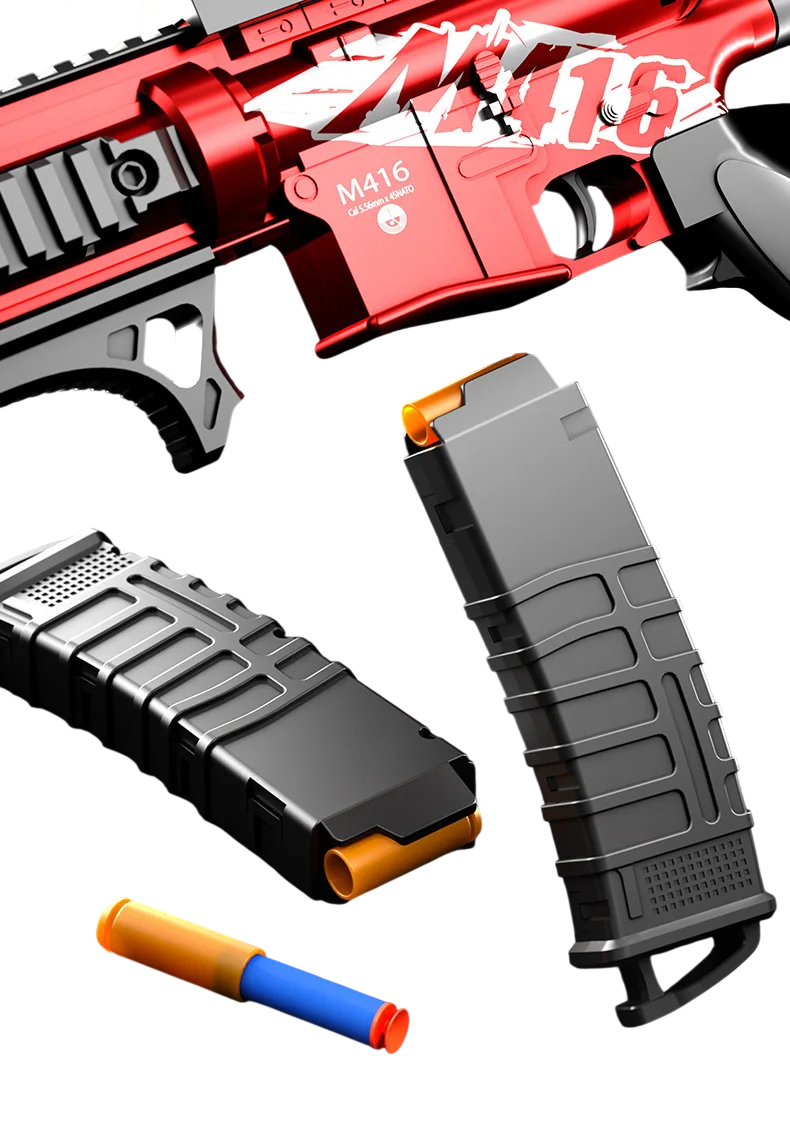 This children's toy inspired by the M416 model brings a realistic appearance and fun gaming options for young fans of action games. Thanks to its high-quality plastic construction, the toy is lightweight, easy to handle, and suitable for long-term play. The package includes soft bullets that ensure safe use during play at home or outdoors. The integrated magazine and scope allow for comfortable and precise aiming. The toy offers a range of up to 10 metres, providing a realistic shooting experience.