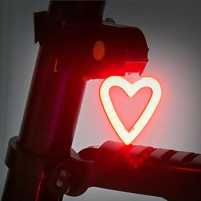 Heart-shaped rear LED bicycle light with 5 lighting modes, IPX2 waterproof rating, long battery life, and USB charging. Full description