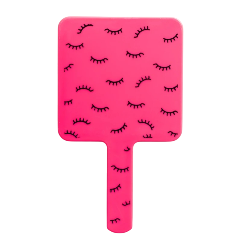 Lightweight handheld mirror with a square design, high resolution, and plastic handle. Great for makeup, eyelash care, and everyday touch-ups. Full description